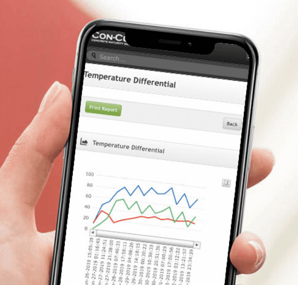 Easily view actual temperature, temperature differentials and strengths of the concrete, in real time.