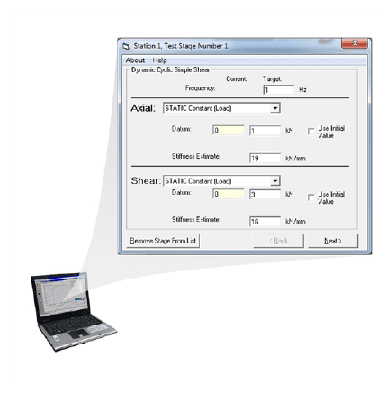 Test control of dynamic axial load or axial displacement, and dynamic control of torque or rotation. Optional dynamic control of inner and outer cell pressure depending on system specification. Note: PC needs to be running GDSLAB