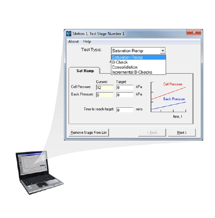 Cell and back pressure control for saturation (stepped to BS standards or ramp), consolidation and B-check tests. Also can perform fully automated stepped loading to BS specification (i.e. automatically checks the B-value and moves on to consolidation stage if not saturated).