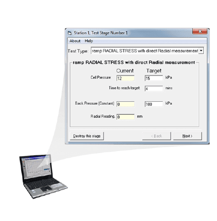 Maintains zero diameter change (K0 conditions) by two methods, either from a direct reading of the specimen diameter or using specimen volume change calculations. Note: PC needs to be running GDSLAB.