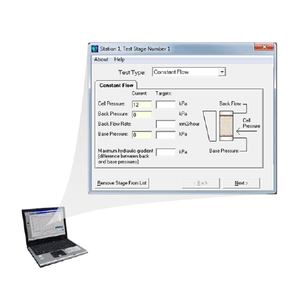 Controls either a constant head permeability test, or a constant flow permeability test with controlled hydraulic gradient control. Note: PC needs to be running GDSLAB.