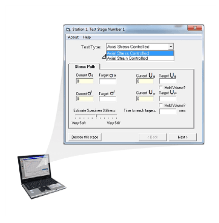 Independent control of the axial axis (load, stress or strain), radial stress, pore water pressure and pore air pressure for complete flexibility of control for unsaturated triaxial tests. Note: PC needs to be running GDSLAB.
