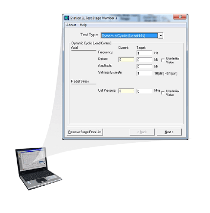 High speed dynamic cyclic triaxial testing with high speed data acquisition. Test control of dynamic axial load or axial displacement, with static cell and back pressure control. Dynamic control of axial stress and/or radial stress is available dependant on hardware. Note: PC needs to be running GDSLAB.