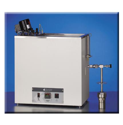 Two different models, both equipped with low liquid-level controllers in accordance with the latest ASTM specifications. Two-unit water analog-controlled water bath can be flush mounted in a table top if desired, and is equipped with an overflow standpipe/drain to maintain the proper depth when the pressure vessels are inserted, and a plated brass reflux condenser to minimize evaporation loss.