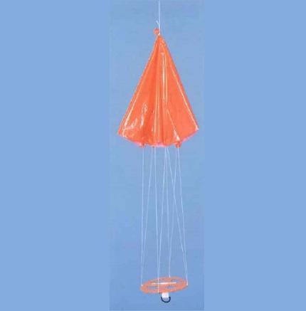 The parachute shall consist of three major components: canopy made of orange/red coloured polyethylene film, cotton shroud lines and orange coloured plastic spreader hoop. A spreader Hoop is equipped with an elastic hanger with D ring for general use. Full Details Here