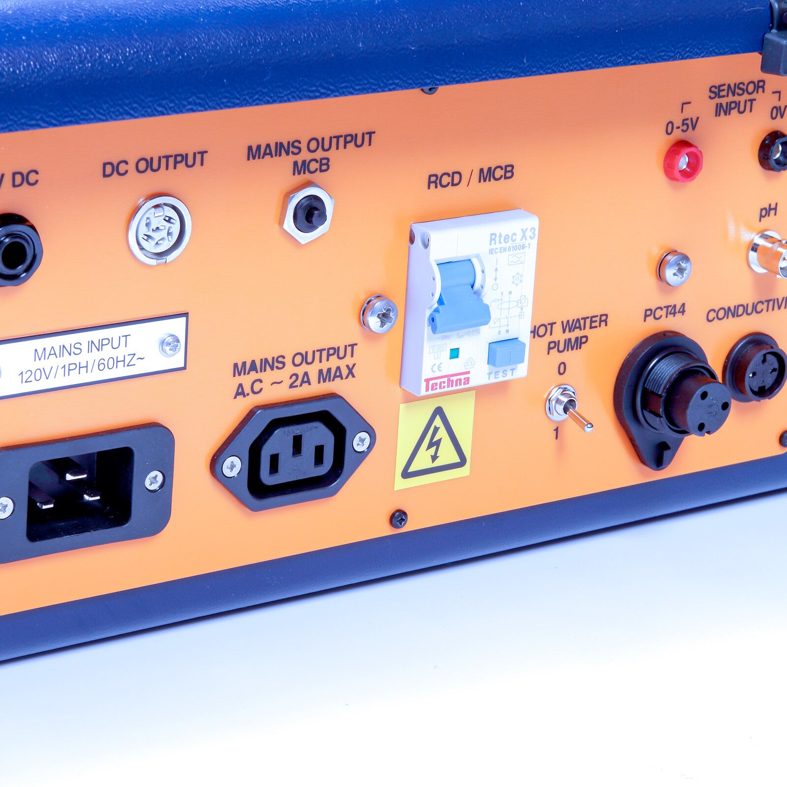 It includes a variable volume process tank, a hot water tank with electric heater and indirect heating/cooling coil, a hot water pump, two non-dedicated pumps, three on/off solenoid valves and a proportioning valve. The instrumentation includes temperature sensors, two differential water pressure sensors, a mechanical level sensor (float switch) and an electronic level sensor (conductivity). The inlets and outlets of the various pumps, valves and tanks incorporate self-sealing quick release fittings. This enables the configuration to be quickly changed, offering a wide variety of different loops.