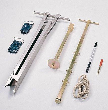 The handgrip hinging with both halves allows both halves to be pushed into the soil alternatingly. A clamp mechanism on the grip allows the profile to be clamped in the sampler when it is extracted from the soil. A small diameter tube is fitted to break the suction of the sample. The standard set contains, among other items: the peat profile sampler, tools, lever beam with support and a hand pump.