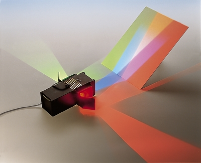 They should first investigate the overlapping of two different coloured light beams and then, in a further experiment, observe the possibility of producing white light and secondary colours by combining three additive primary colours – red, green and blue.