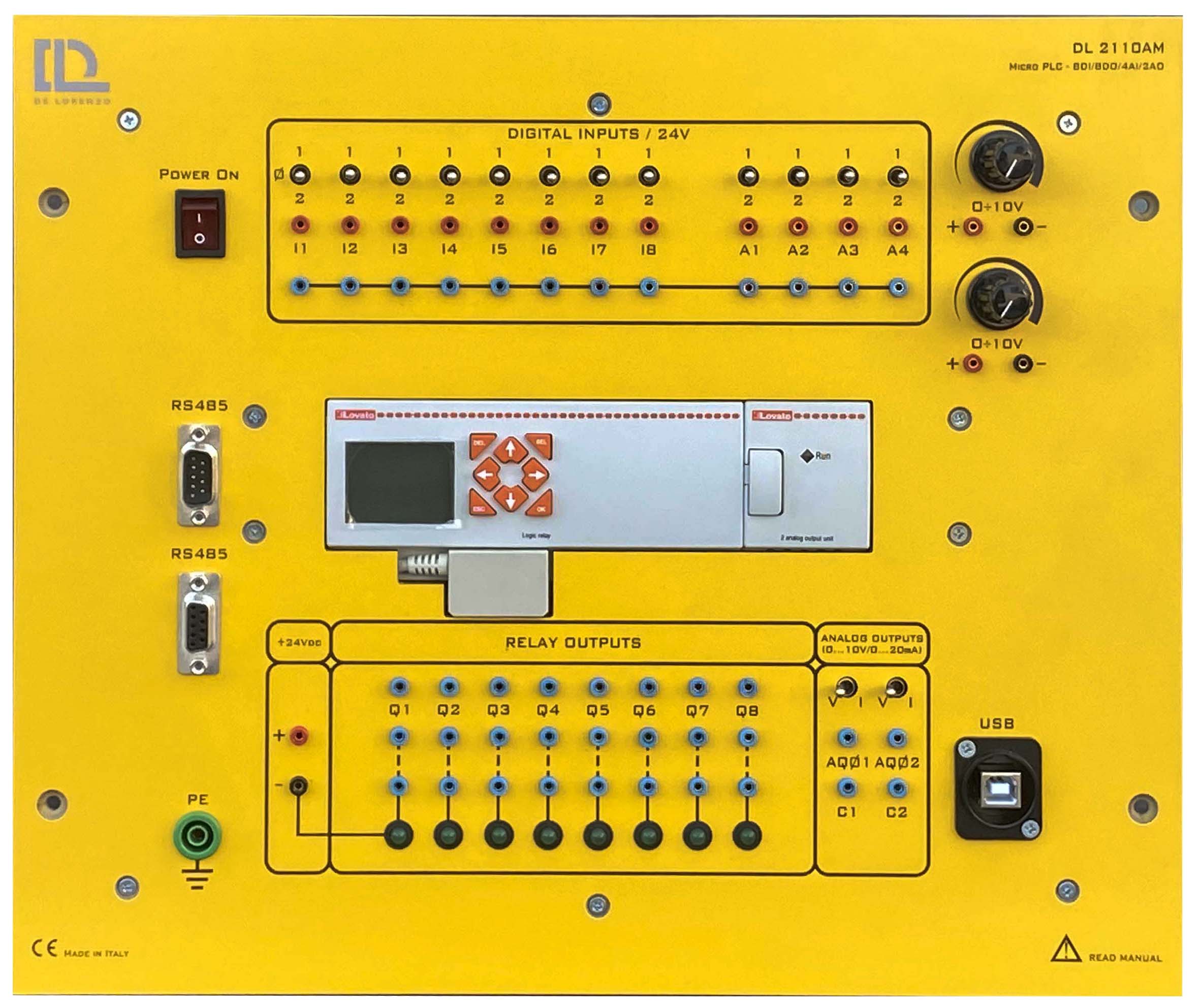 The DL 2110AM is a programmable controller that combines high performance and ease of use for those who are entering the world of PLCs for the first time and can be configured both for the frame and for the bench.
