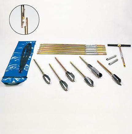 The prospecting kit includes 4 types of Edelman augers (clay-, sand-, coarse sand- and combination type), a Riverside auger, a stony soil auger and a handle with extension rods. The augers and extension rods have bayonet connections; a very fast coupling with little weight.