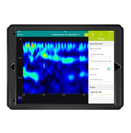 The Swiss Made Pundit Live Array Pro is wirelessly connected with an iOS app to an Apple® iPad. Thus, the Pundit Live Array Pro allows instant imaging on a high-resolution touchscreen of up to 12.9 inches (iPad Pro) which makes it the largest ultrasonic pulse echo display in the industry.