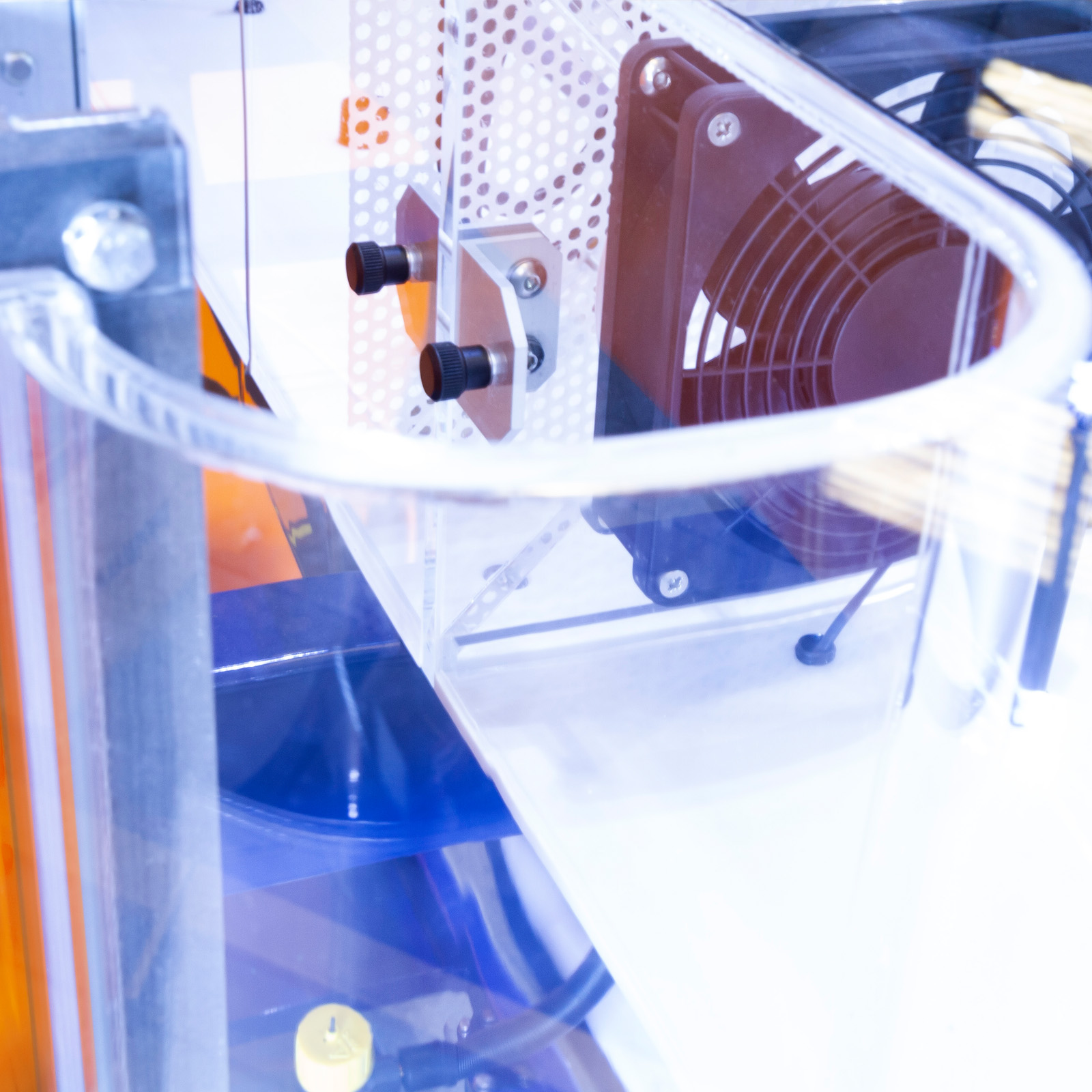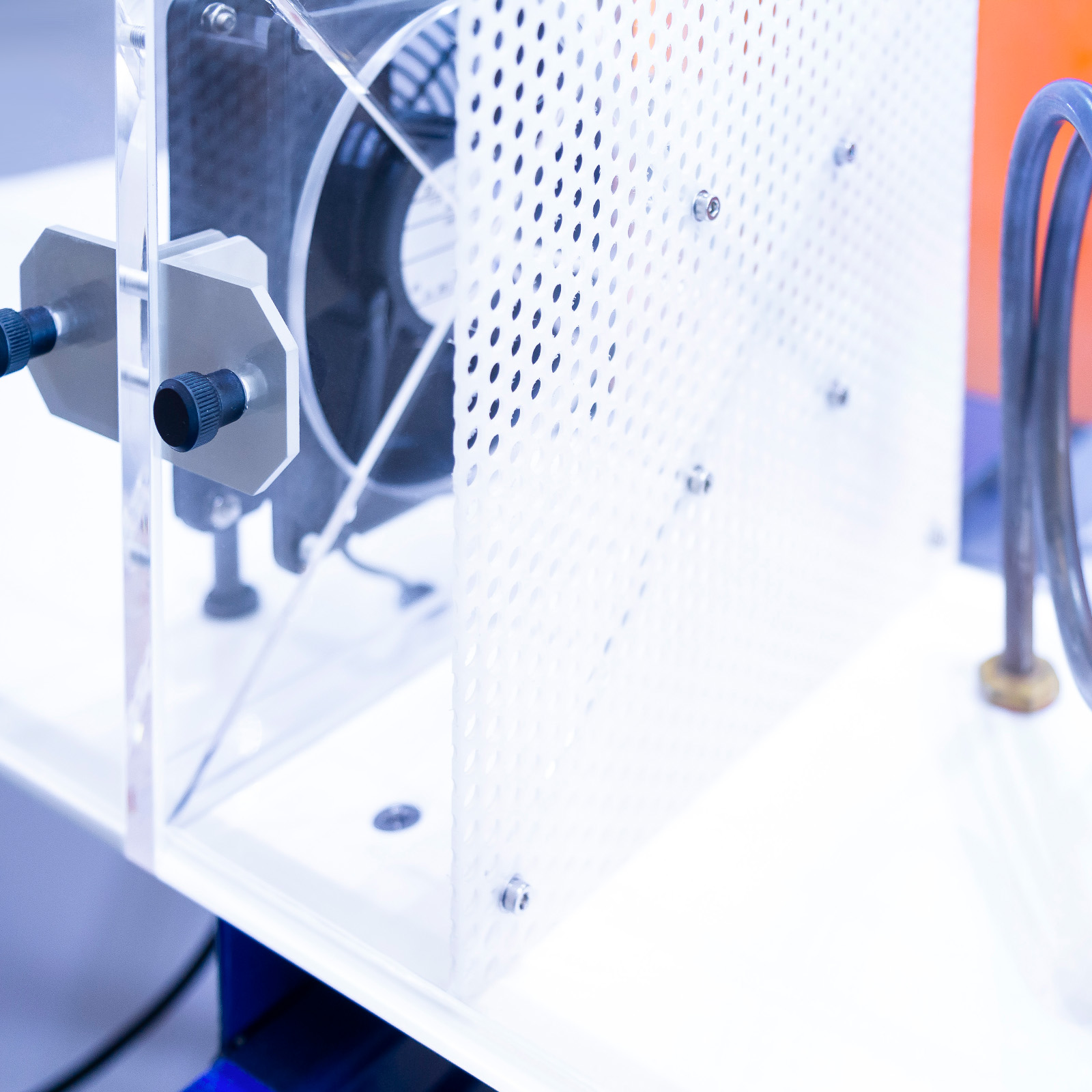 The RA3 is a floor standing, self contained unit comprising a square ventilation duct mounted on a mild steel frame. The duct has a clear acrylic section allowing visibility of all components.