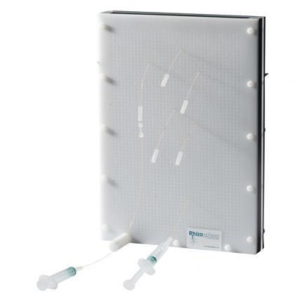 RhizonBoxes for a direct sampling of soil moisture in the rhizosphere during growth experiments or root research. In the front plate, there are 2183 holes with a lateral distance of 5 mm, which allow direct sampling near the roots with MicroRhizons.
