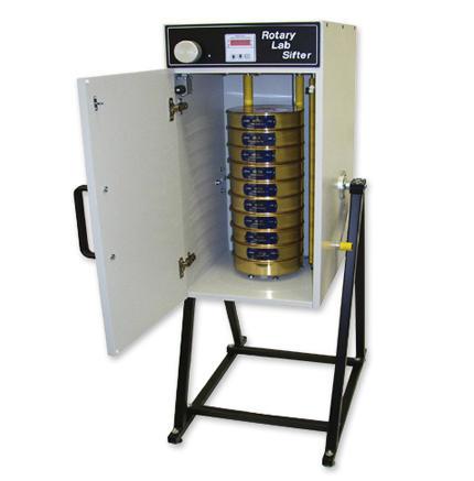 The Rotary Lab Sifter quickly and efficiently processes samples in either 8″(203mm) or 12″(305mm) sieves. Simple conversion between the two sieve sizes takes less than a minute and requires no tools. Sieve stacks require no clamping and the mechanism is completely enclosed. The sieve stack is continuously rotated at an angle. UHMW polyethylene faced hammers apply additional agitation for effective separations. Sieve stack capacity is 6 full-height, 12″ sieves plus pan, or as many as 20 8″, half-height sieves plus pan. Case construction is dense, humidity and impact resistant MDF board. The case is joined to the heavy-gauge tubular steel frame with steel pinions. A safety switch cuts power if the door is opened during operation. The digital countdown controller with large red LED display precisely times test cycles. Settings are saved between cycles, allowing precise repeatability and one-button operation. The timer has a pause function and selectable modes for operation up to 99 hours, 59 minutes. Assembled dimensions are 19x24x58″