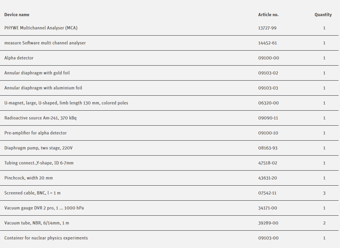 The relationship between the angle of scattering and the rate of scattering of alpha-particles by gold foil is examined with a semiconductor detector. This detector has a detection probability of 1 for alpha-particles and virtually no zero effect, so that the number of pulses agrees exactly with the number of alpha-particles striking the detector. In order to obtain maximum possible counting rates, a measurement geometry is used which dates back to Chadwick. It is also possible in this case to shift the foil and source in an axial direction (thus deviating from Chadwick’s original apparatus), so that the angle of scattering can be varied over a wide range. In addition to the annular diaphragm with gold foil, a second diaphragm with aluminium foil is provided in order to study the influence of the scattering material on the scattering rate.