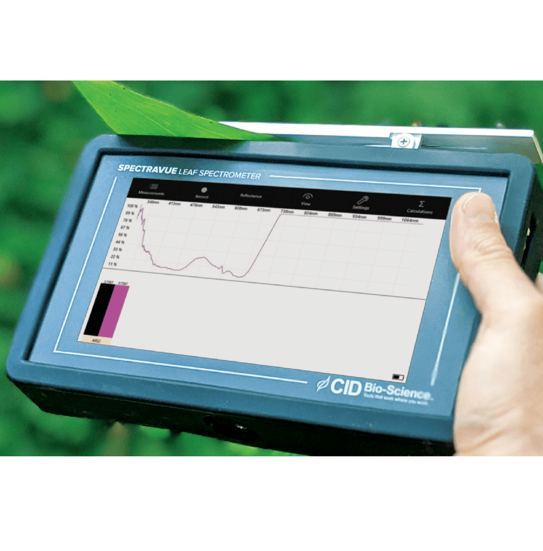 The newly redesigned SpectraVue Leaf Spectrometer has been upgraded with an all-new spectrometer (360-1100 nm) to allow full operation in a handheld form factor with a 7” 1024 x 600 IPS touchscreen display. This allows easy portability for remote operation with a full suite of built-in analysis software.