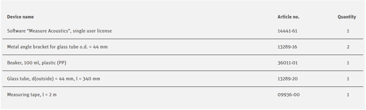 During this experiment, examine how there can be places in a hollow body where no sound can be heard in spite of a continuous generation of sound. A case like this, when the air particles obviously do no longer oscillate in some places, i.e. when they “stand”, is also referred to as a standing wave. Observe the sound propagation without a hollow body. Produce a standing wave in a hollow body (glass tube). Examine the conditions under which standing waves occur.
