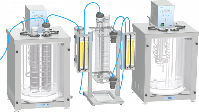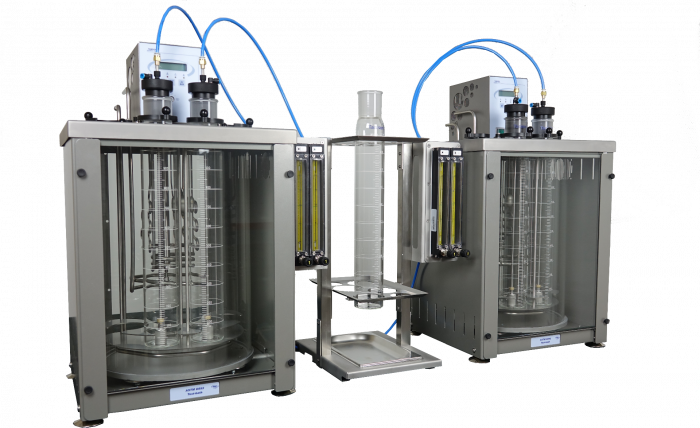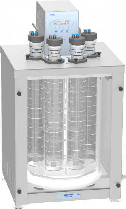 The Tamson foaming dual bath can be used to test the foaming characteristics of lubrication oils conform ASTM D892. The apparatus comes with two baths that can interchangebly be operated at 24°C and 93.5°C. With the two baths, a rack with four flowmeters is standard supplied. Each bath has four openings for foaming cylinders. The rack can be used to hold up to four foaming cylinders, for example between sequence II and III of the test method. Also, the stoppers and optional dryer can be mounted on this rack. The baths are equipped with a metal case for safe operation of the foaming baths. Furthermore, the baths offer an excellent temperature stability and have a drain for easy draining of the bath fluid. Tamson can supply all accessories needed for foaming tests according to ASTM D892.