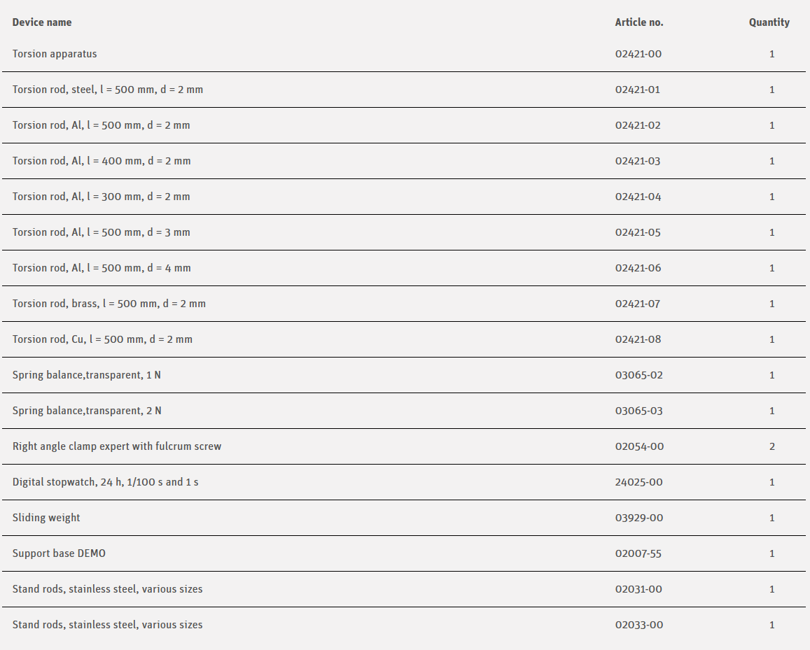 Bars of various materials will be exciting into torsional vibration. The relationship between the vibration period and the geometrical dimensions of the bars will be derived and the specific shear modulus for the material determined.