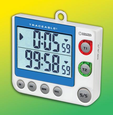Allows simultaneous programming of two different activities from 99 hours, 59 minutes, 59 seconds to 1 second. Resolution is 1 second; accuracy is 0.01%. Each channel has a distinct electronic alarm and visual indicator when zero is reached. The alarm may be turned off or silenced automatically after 1 minute.