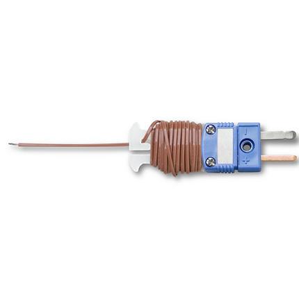 A Type T thermocouple probe that includes 1.8m (6') of insulated 30-AWG wire wound on an integrated spool caddy/subminiature connector. Color-coded for type T (blue) thermocouples according to the ANSI standard, this probe is teflon-insulated.