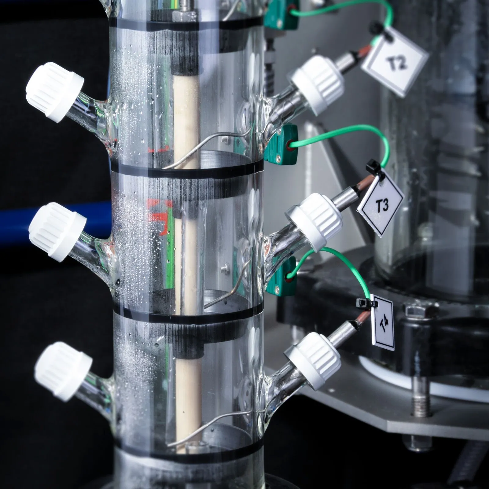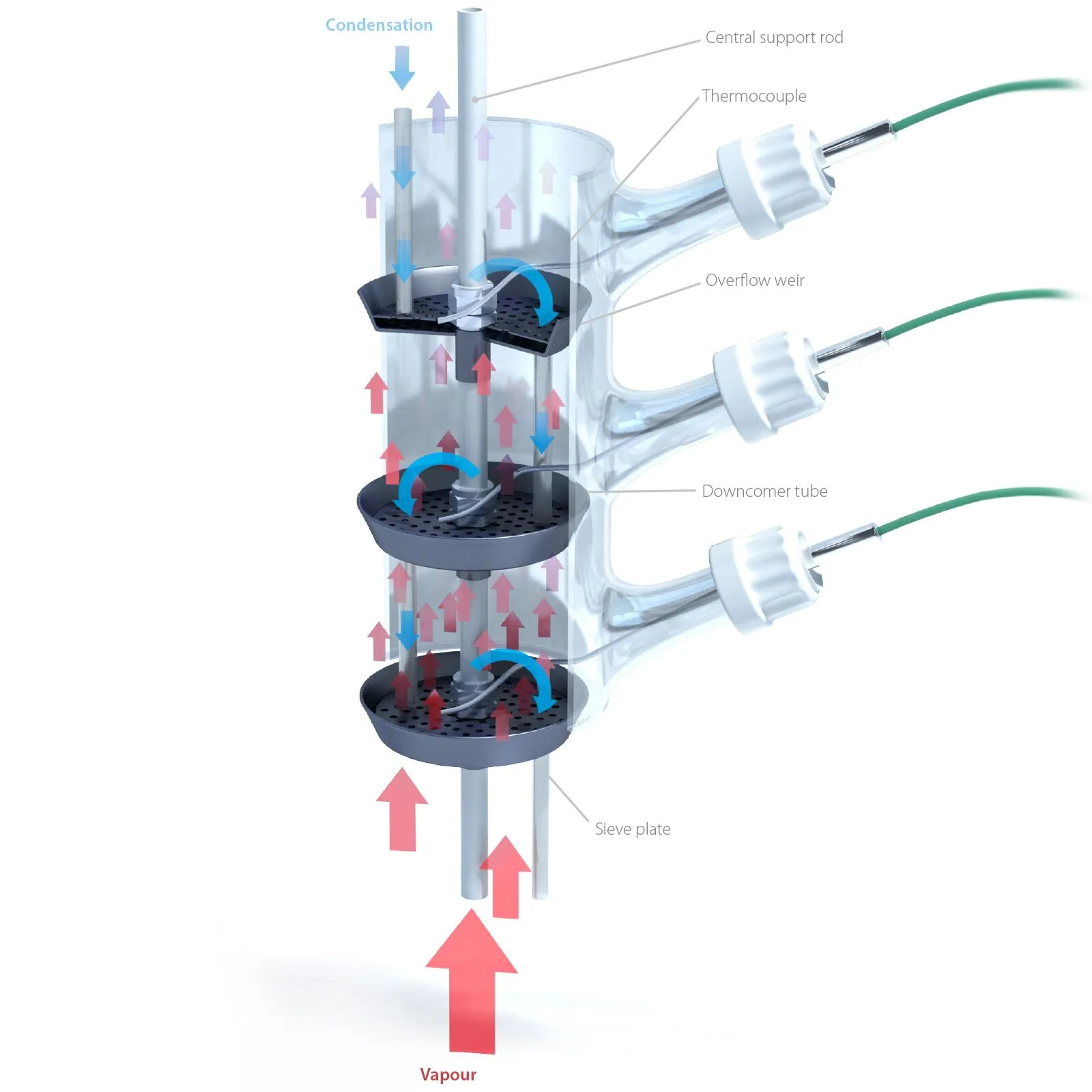 A 50mm diameter plate distillation column containing eight sieve plates and downcomers. Every plate includes a temperature sensor positioned to measure accurately the temperature of the liquid on each plate. The sheaths of each plate temperature sensor are not more than 1.5mm diameter to ensure rapid dynamic response.