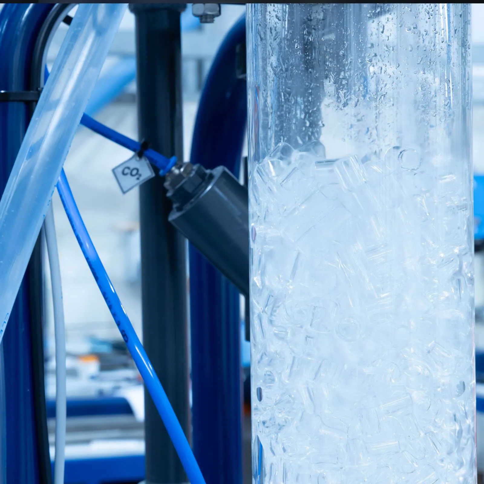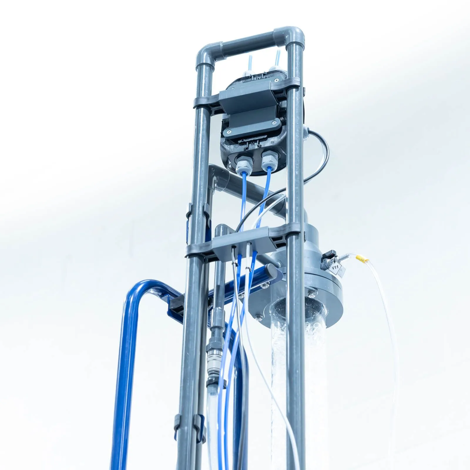 For the liquid phase, water (or a solution of sodium hydroxide) is pumped to the top of the column where it falls through the packing material. The gas and liquid phase flows counter-currently. This increases the contact time and diffusion of CO₂ into the liquid phase.