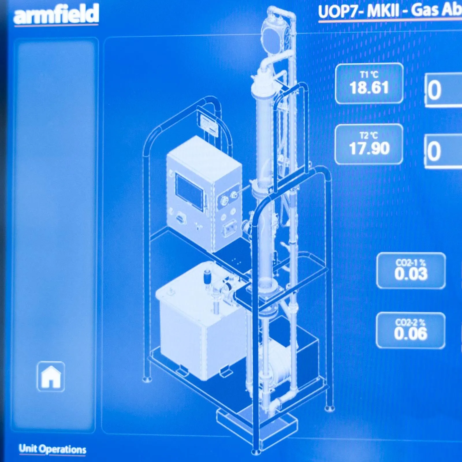 In the UOP7-MkII, a gas phase consisting of CO₂ and air is introduced into the bottom of the packed column. Adjustment of their flow ratio is obtained by manual valves. A sample of the gas mixture is sent to a CO₂ concentration sensor located inside the electric console, and readings of flows and percentage CO₂ concentration is visible on the display screen as well as in the software.
