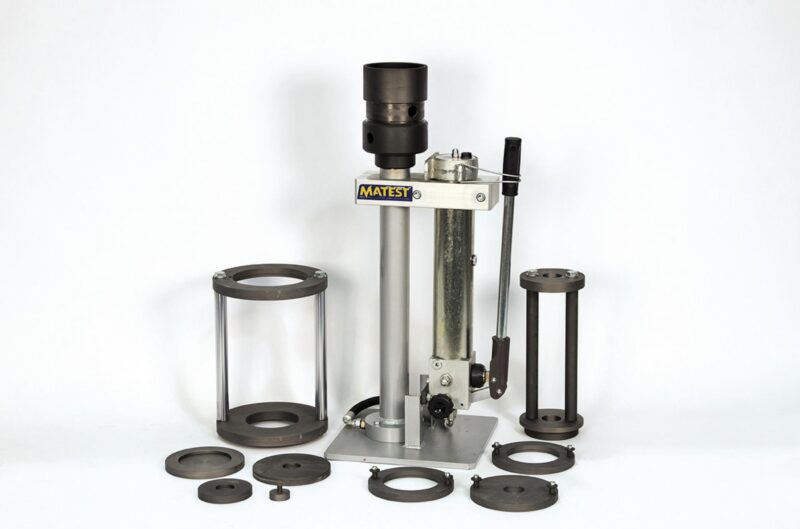 This hand-operated extruder is actuated by a 60kN hydraulic jack, ram travel 480 mm. It accepts standard U4 tubes and samples from 35 to 152 mm diameter.