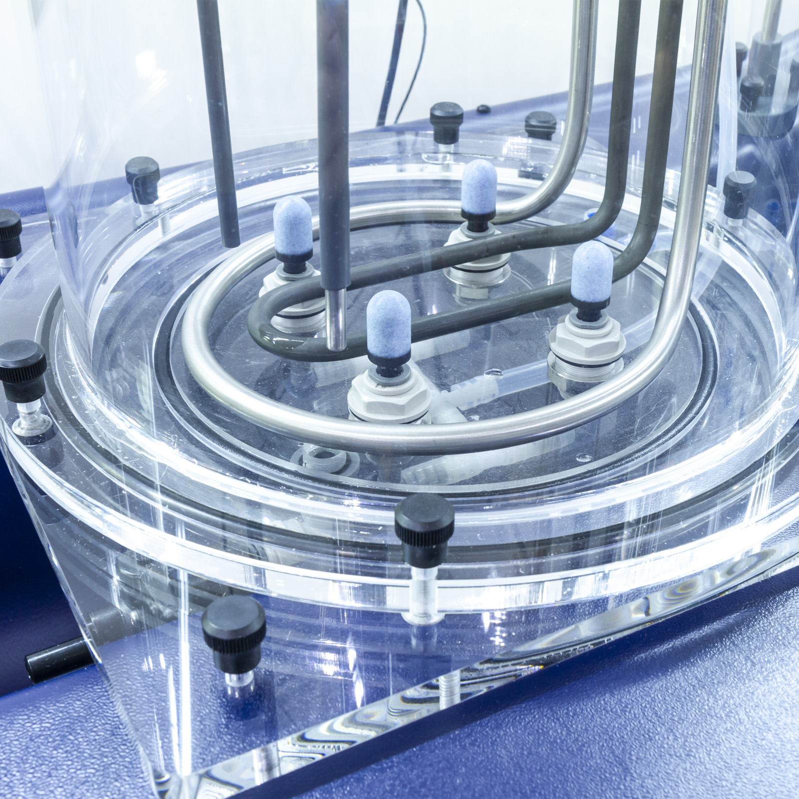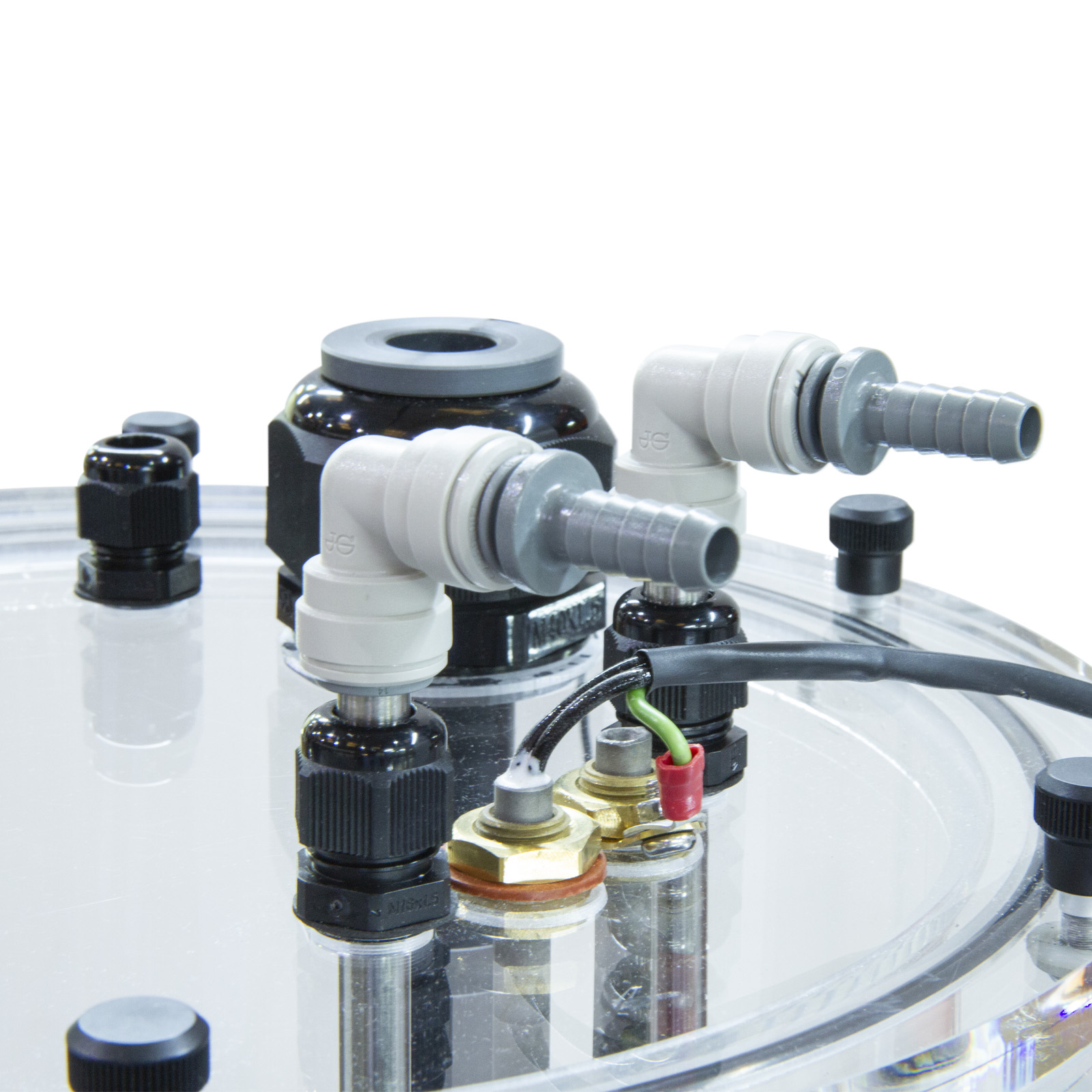 The reactor lid contains a gas exit port, suitable for sampling the gases for subsequent analysis.