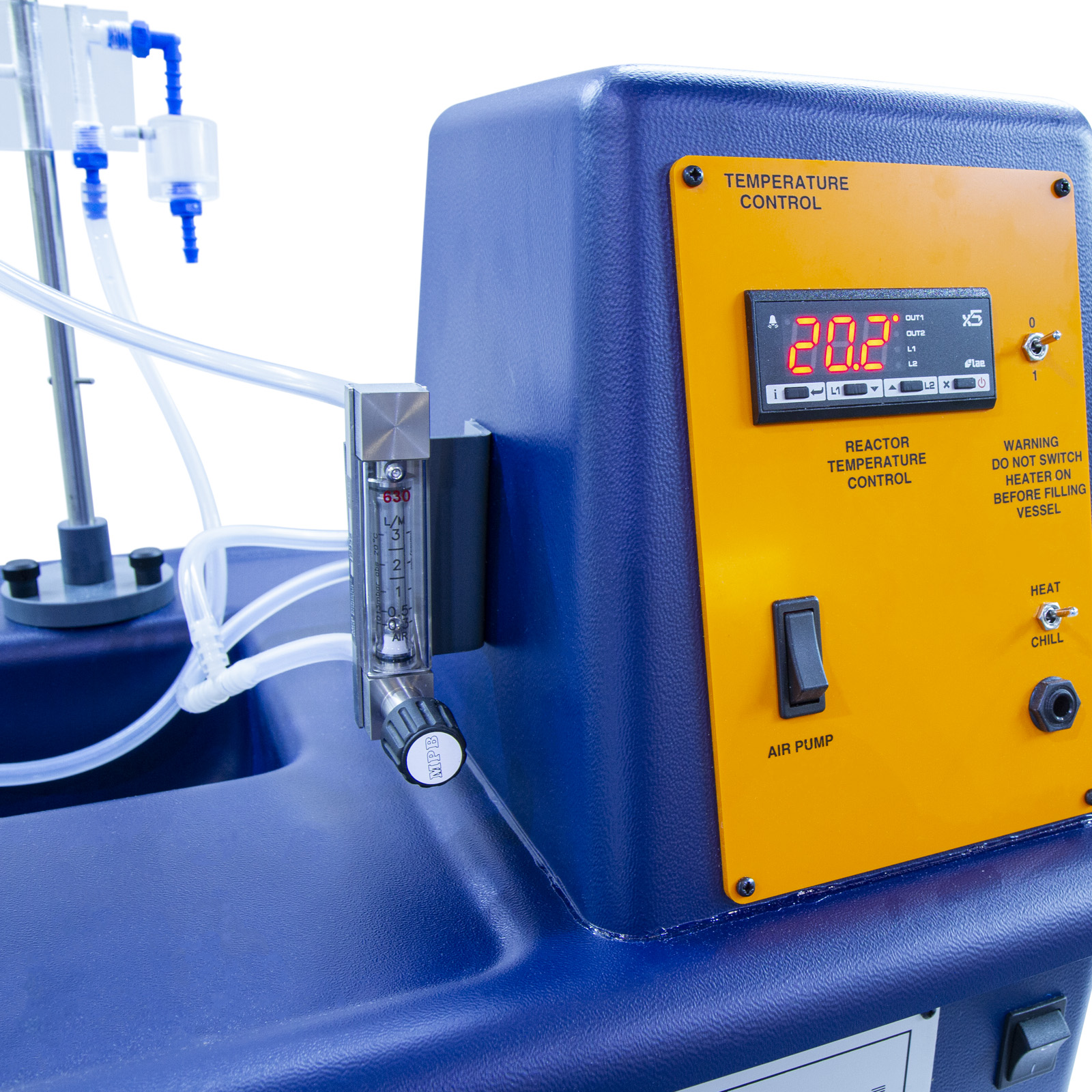 The pump delivers the feed to the reactor vessel through a transparent lid. Air is supplied at a measured rate by a small compressor, and discharges into the base of the reactor via a spider-arm dispenser. This design prevents blockages and produces sufficient bubbling for stirring and reaction. The liquid level in the reactor is maintained at a constant value of five to ten litres, by an adjustable overflow device connected to the outer annular chamber of the vessel. Discharge is by gravity to a floor-standing product tank (not supplied).