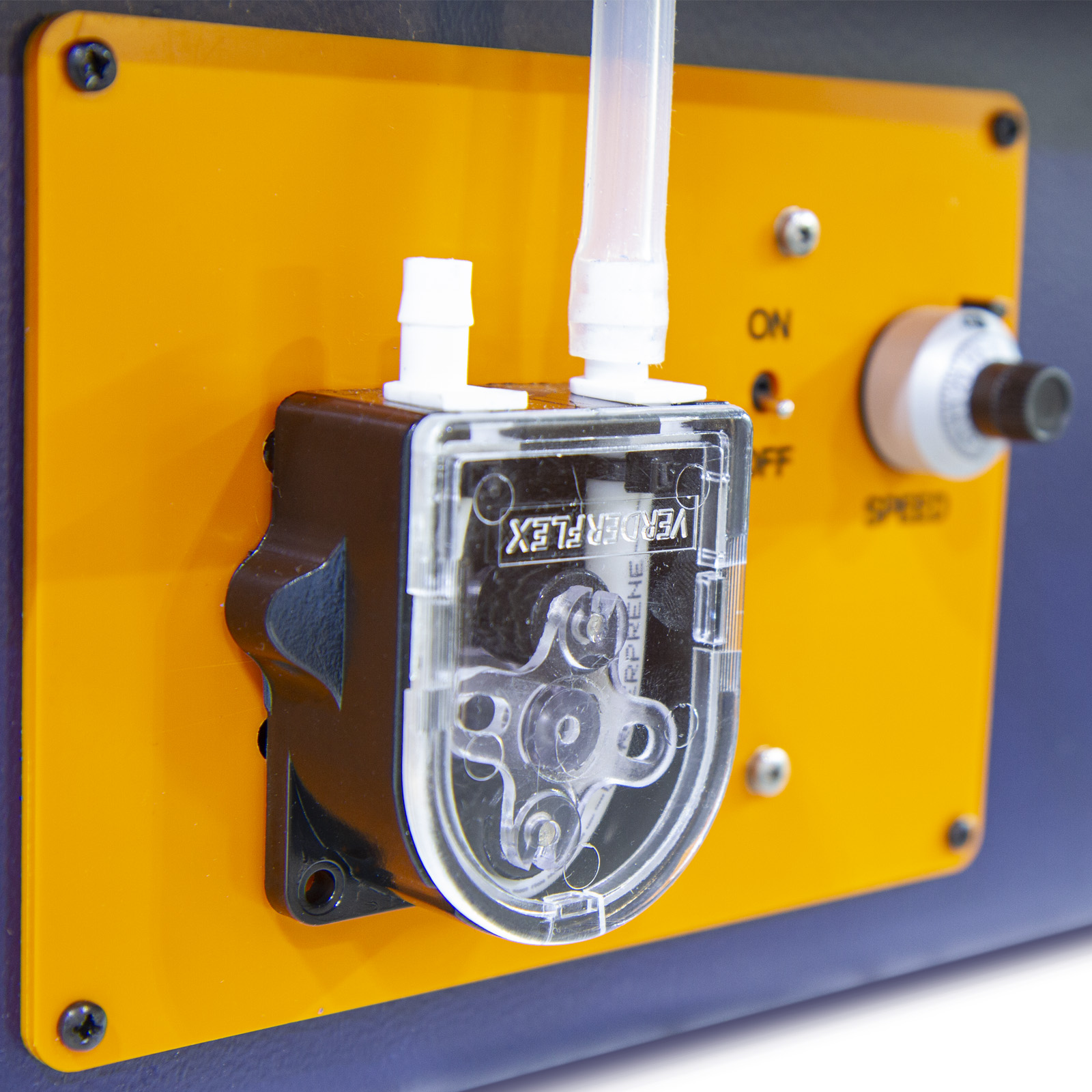 Waste water is drawn from a floor-standing feed tank (not supplied) by a DC motor-driven peristaltic pump. Rotational speed – and thus flow rate – is accurately set by a ten-turn potentiometer.