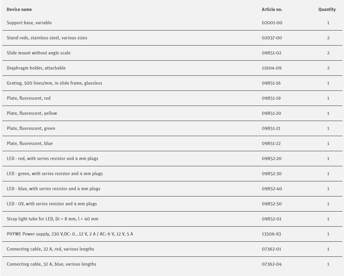 For carrying out this experiment the room should be rather dark, particularly for the part where the spectrum is viewed through the grating. It is important not to look directly from the front into the light cone. If you have a problem seeing a colour there is the further option of slightly increasing the distance between the fluorescent screen and the tube and viewing the colour of the light spot on the screen. In this case only that part is reflected which does not contribute to the fluorescence.