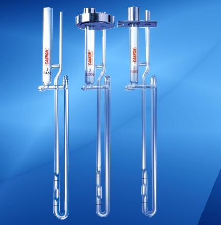 For measurement of kinematic viscosity of transparent and opaque Newtonian liquids according to ASTM D 445 and ISO 3104. Specifications conform to ASTM D 446 and ISO 3105. Also used to measure kinematic viscosity of liquid (cutback) asphalts and road oils at 60°C (140°F) and asphalt cements at 135°C (275°F) in the range of 30 to 6000 centistokes according to ASTM D 2170. Can be filled and cleaned while in constant temperature bath.