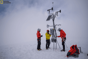 The team works on the weather station at Ausangate. L to R: Tom Matthews, Sandro Arias, Baker Perry. Credit Justen Bruns/National Geographic.