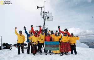 The team celebrates in front of the weather station on Ausangate. Credit Justen Bruns/National Geographic.